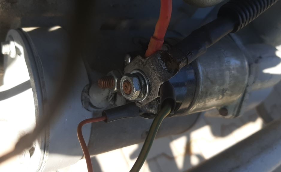 Na pierwszy ogień poszedł rozrusznik - elektromagnes albo klekotał albo po odpaleniu zacinał się w pozycji start. Podobno elektromagnes był wymieniany na nowy. Założyłem stary elektromagnes (z pudełka ze starymi klamotami od tego traktora) i działa. Przyczyną klekotania były złe styki na kablu od akumulatora - końcówki przy klemach luźne i nie zarobione, oczko przy rozruszniku kompletnie zardzewiałe i o dwa razy większej średnicy (chyba od czołgu) i kombinacją nadwymiarowych podkładek.