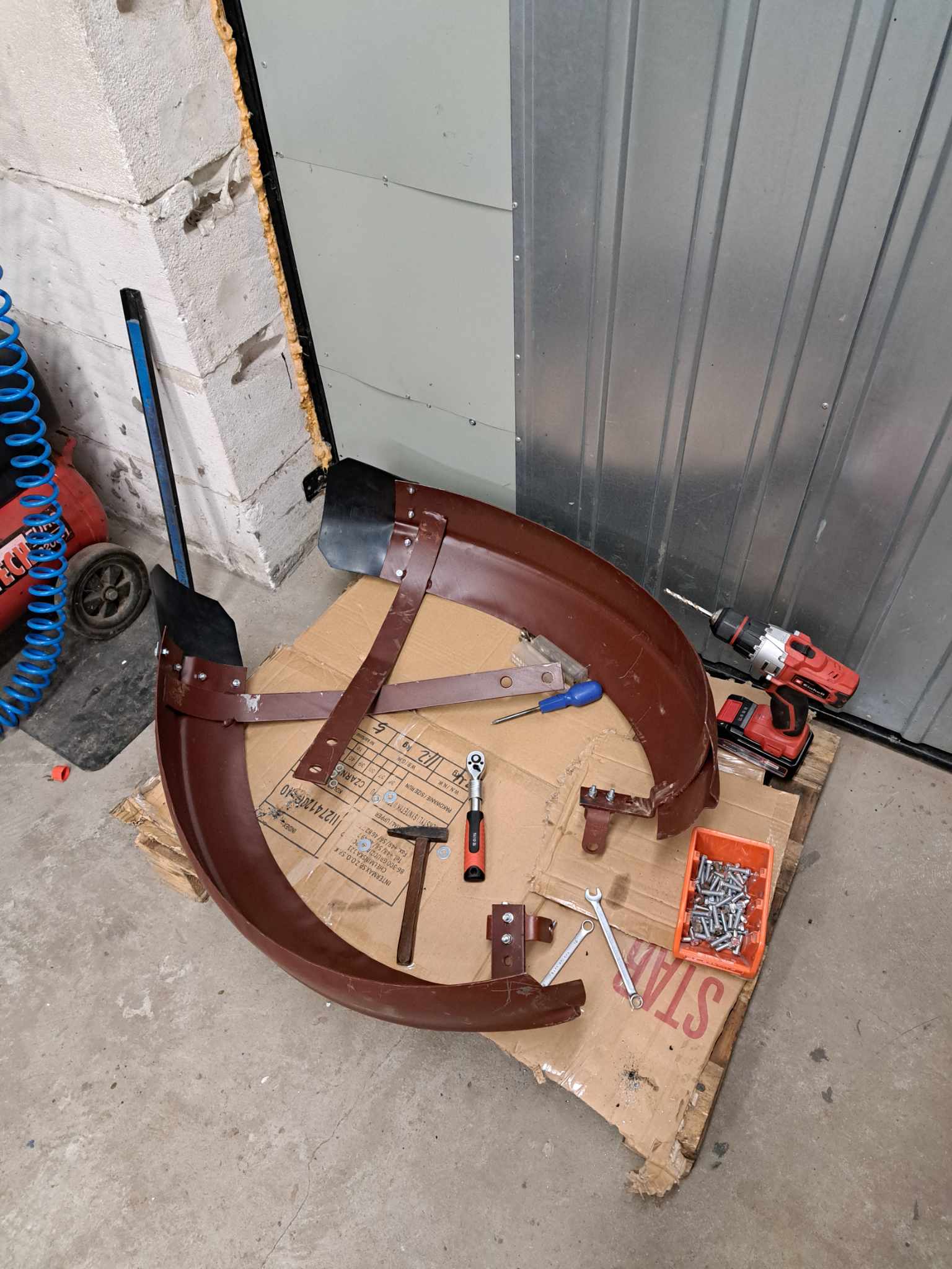 Błotniki nawet okej, choć blacha niezbyt gruba, ale starczy. Do wąsa zwrotnicy nie problem przymocować, bo uchwyt pasuje, gorzej na dole, zostaje przyspawać śrubę lub nakrętkę i przykręcić, ale to chyba żeliwo, więc będzie ciężko przyspawać.