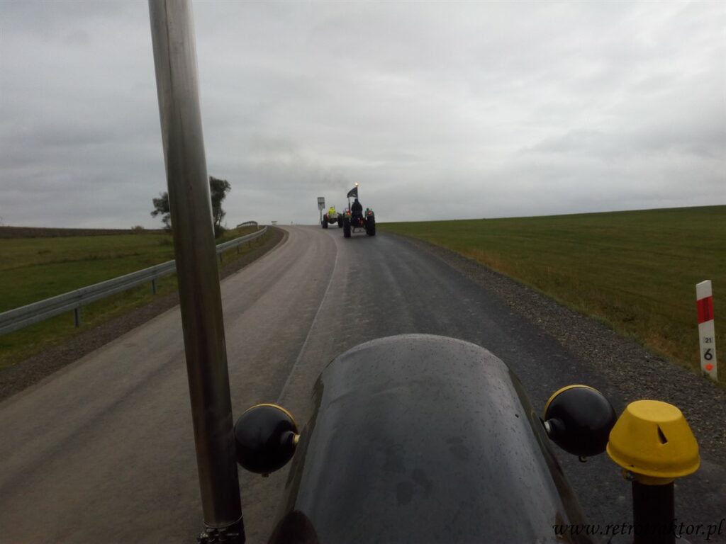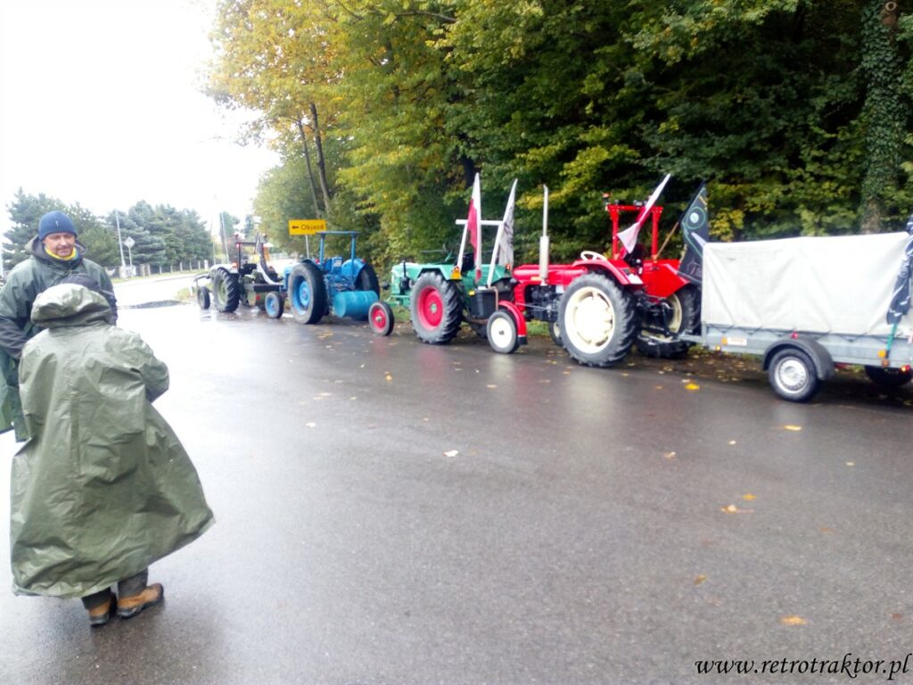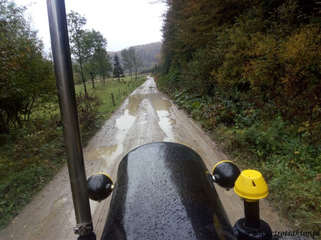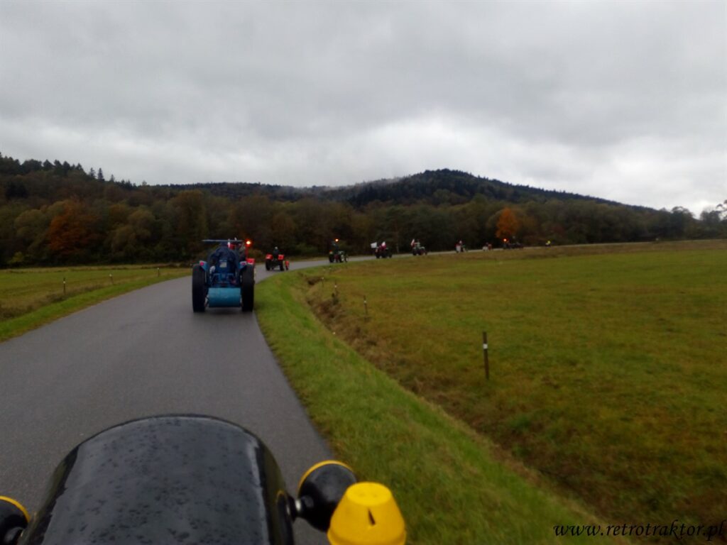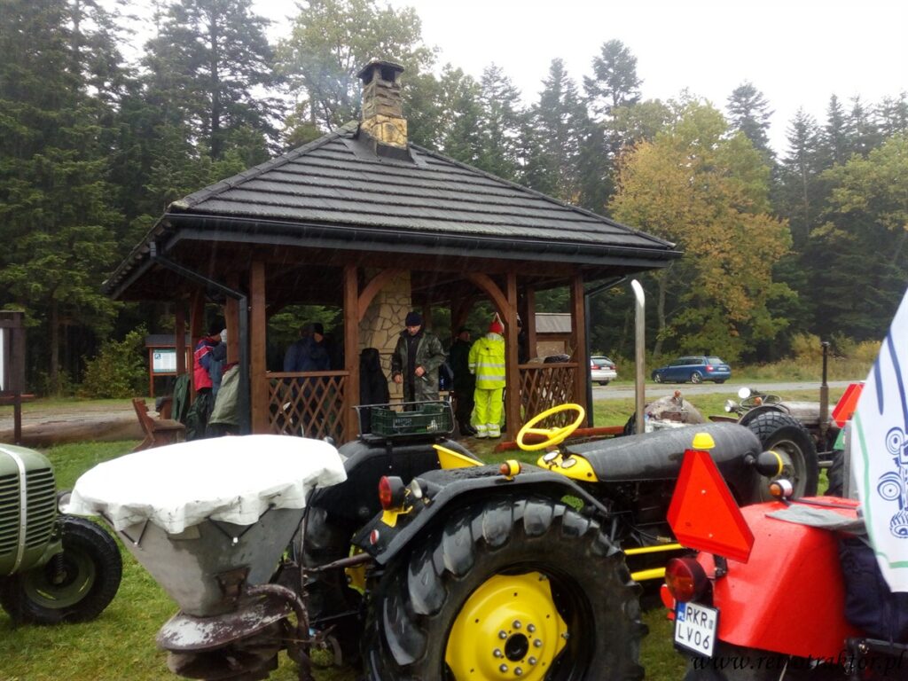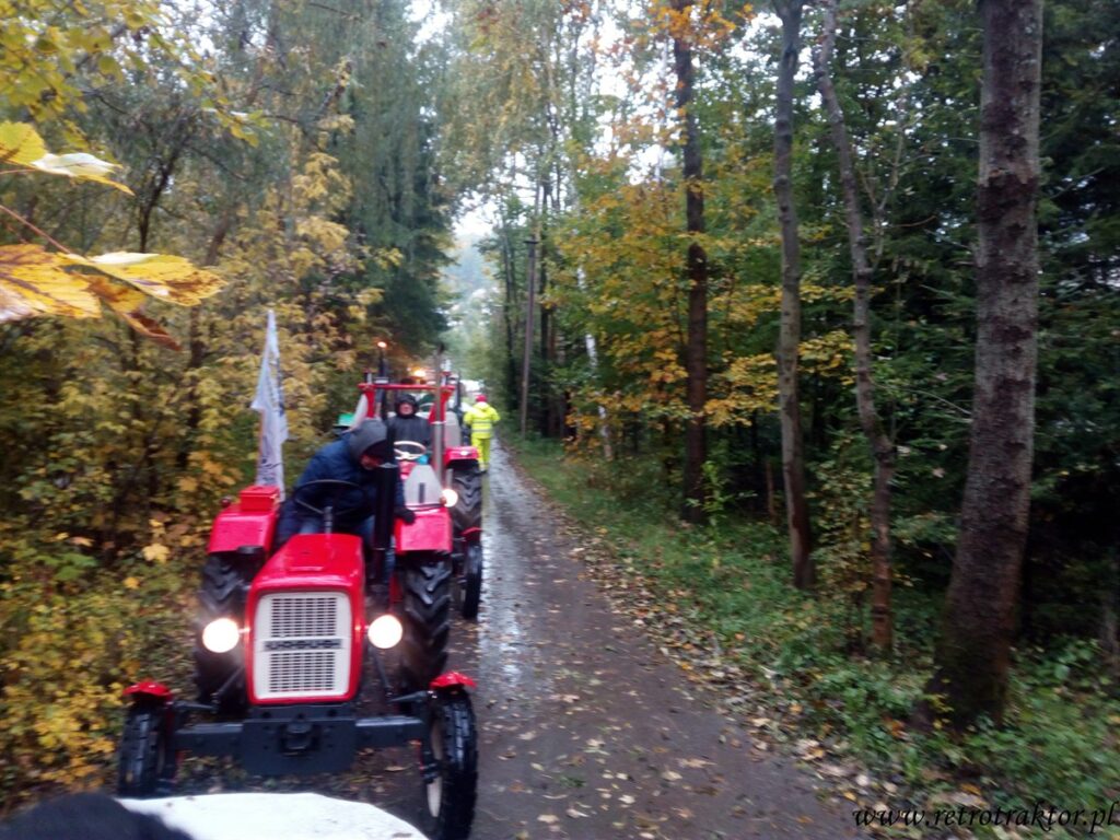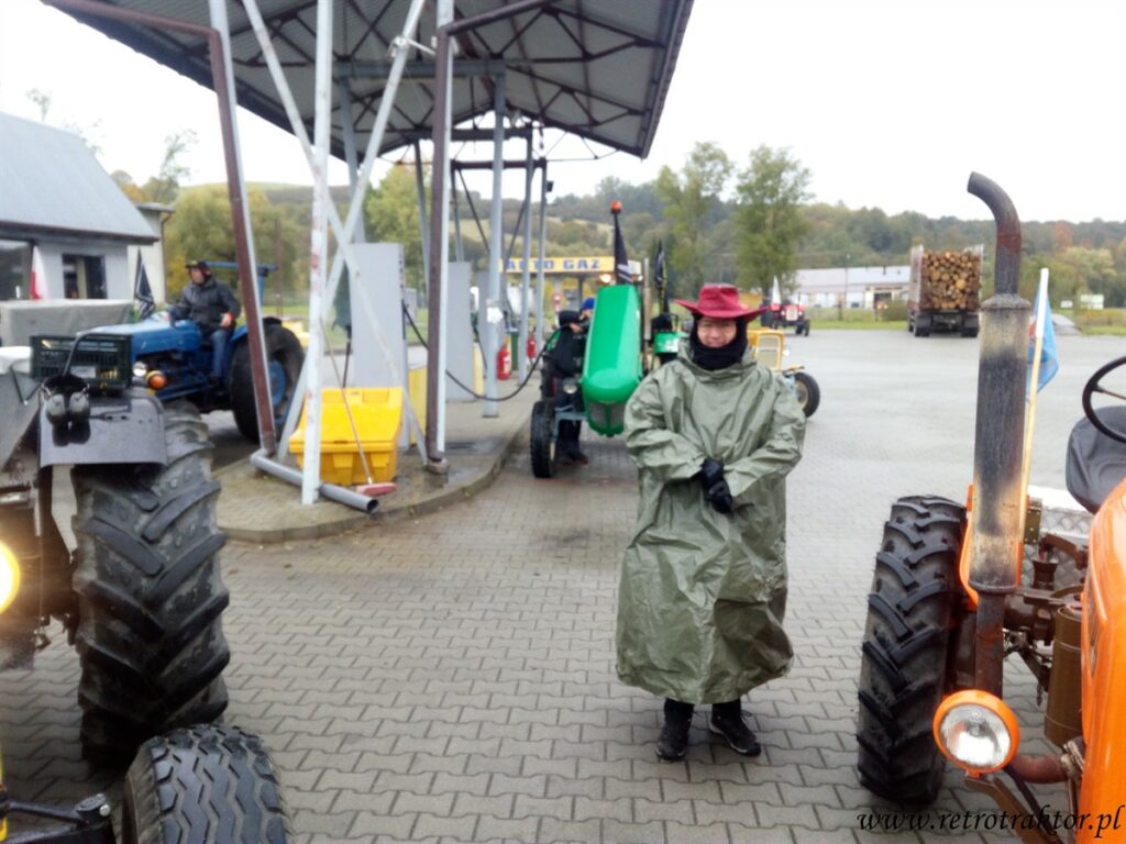 W piątek 12 października na miejscu startu Rajzy zgromadziło się 15 niezrażonych podłą pogodą uczestników. Od rana mokro, zimno i zbierało się na deszcz, który zaczął padać już godzinę po wyruszeniu w trasę z Odrzechowej i towarzyszył nam przez cały dzień. Tak więc zakutani w kurtki i peleryny jechaliśmy z Odrzechowej przez Bukowsko, Płonną do Szczawnego, gdzie zatankowaliśmy nasze traktory. Dla kogo wystarczyło ten się doposażył w dodatkową pelerynę, gdyż na stacji mieli tylko kilka sztuk. A kto w poprzednich edycjach zmókł, ten wiedział że najlepiej założyć dwie peleryny jedna na drugą, przy czym wierzchnia typu pałatka zakrywająca siedzenie, żeby pod tyłek w czasie jazdy nie podciekało ;D