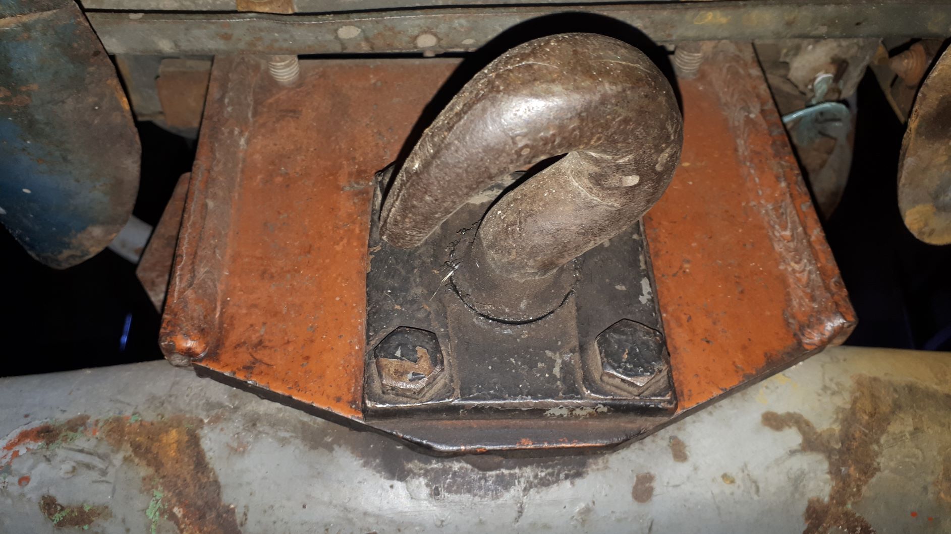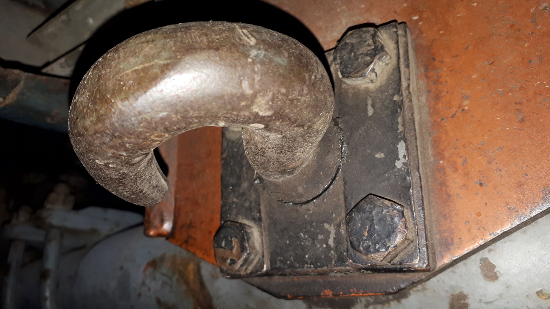 Nie ma szans...tylko puścił spaw na wierzchu...bo tylko tu jest to do kupy pospawane.Płytka z czterema otworami pod śruby M12 ma na środku otwór przez który przekłada się końcówkę haka.Następnie na wystającą końcówkę nakłada się tulejkę z dziurą na kołek,która też w środku jest wybrana.Spawa się hak w środku tej tulejki.A żeby hak nie obracał się względem płytki spawa się go z wierzchu do owej płytki.A to żeby sworzeń osi nie obracał się wokół hak z płytką i z kołkiem robi że tak powiem za element ustalający
