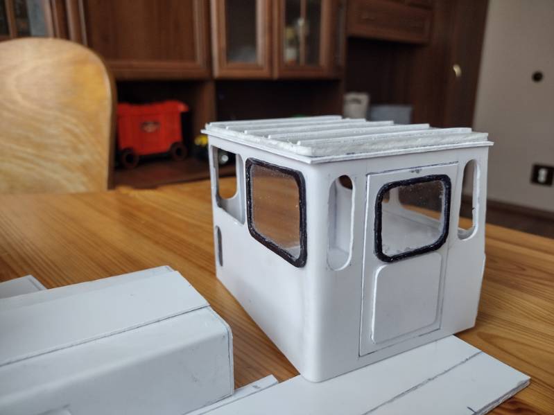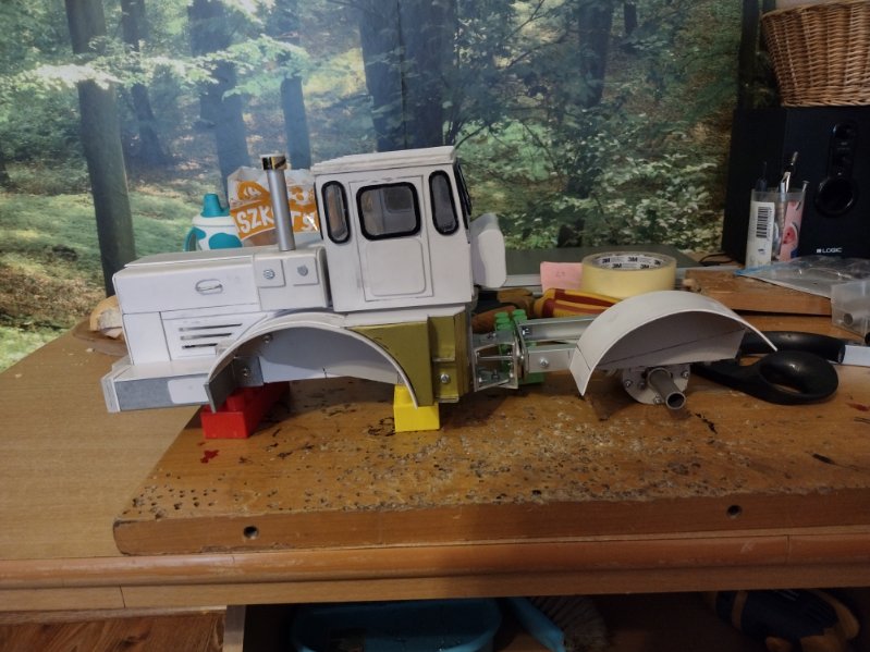 Wymiary ciągnika bez urządzeń zaczepowych to: długość 370mm, szerokość 170mm , wysokość od podłoża do dachu nie wliczając filtra powietrza 195mm , jeżeli chodzi o napęd to będzie 4x4 tak jak w skali 1:1 z kardanem w miejscu łamania. Teraz na dniach będę wykonywał skrzynkę rozdzielczą przekazującą napęd na dwie osie. Dziękuję za miłe słowo.