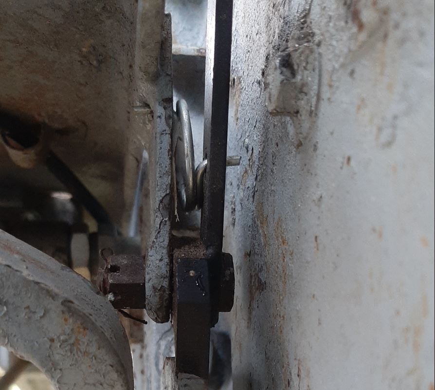 U mnie to wygląda tak (widok od przodu). Niestety dojście kiepskie, bo to jest pod pomostem, ale widać jak sprężyna jest zaczepiona. I mnie dźwignia z zapadką jest nowa, dlatego czarna, a nie pomalowana jak na zdjęciu Grigsa