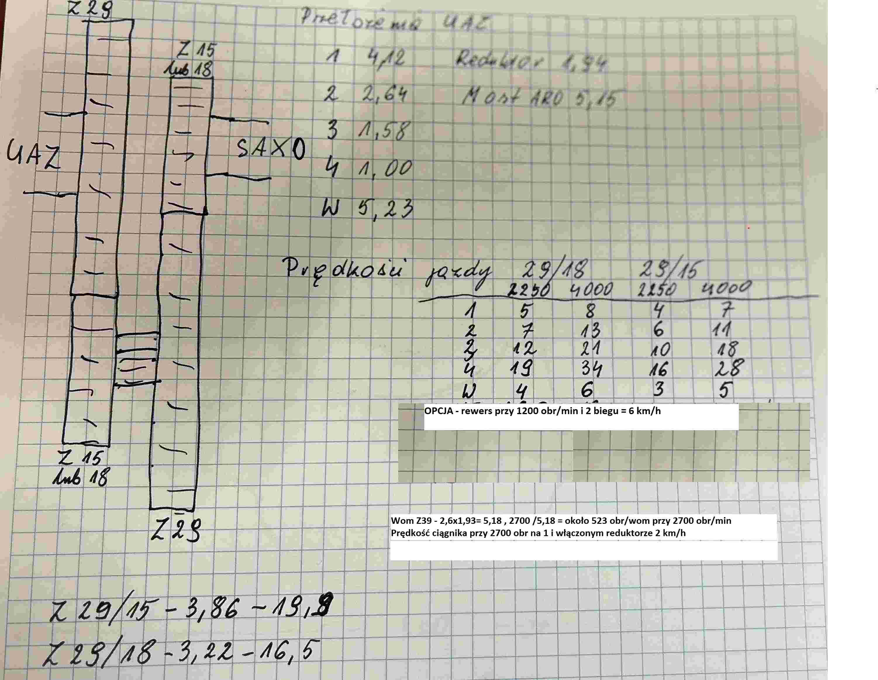 Ale teraz mam namieszane w głowie, może faktycznie trzeba usunąć skrzynię saxo ( zostawić tylko obudowę sprzęgła i podeprzeć tylko dodatkowo wałek sprzęgłowy ) i go połączyć z skrzynką uaza aleeee... w takim wypadku będę miał po włączeniu 1 i reduktora na wolnych - 800 obr/min już 3 km/godz,
