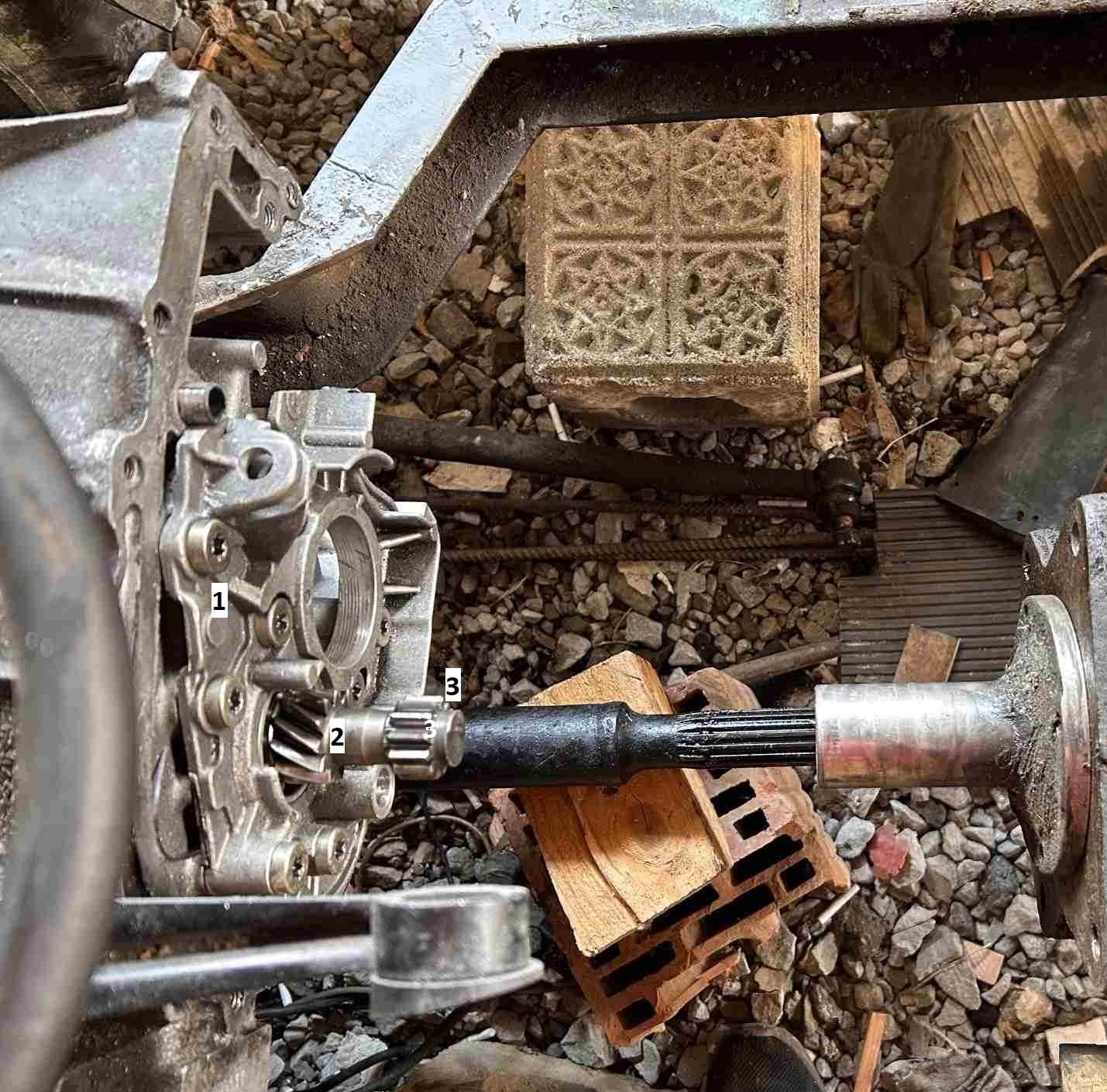 Muszę zeszlifować część koła zębatego ( nr 2 ), wydłużyć obudowę łożyska i dać dodatkowe łożysko podtrzymujące wałek sprzęgłowy ( od strony koła zamachowego nie ma podparcia wałka )
