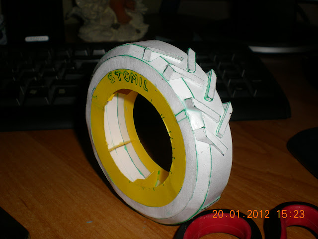 Z tym zapytaniem jak je zrobię. Jest ono wykonane z kilku ukośnych okręgów. No to przyklejony także papierowy protektor (roboty z tym od cholery). Zostanie także zrobiony na boku napis STOMIL. Wszystko zostanie pomalowane czarną farbą i na koniec założone i przyklejone na felgę. To chyba tyle :)