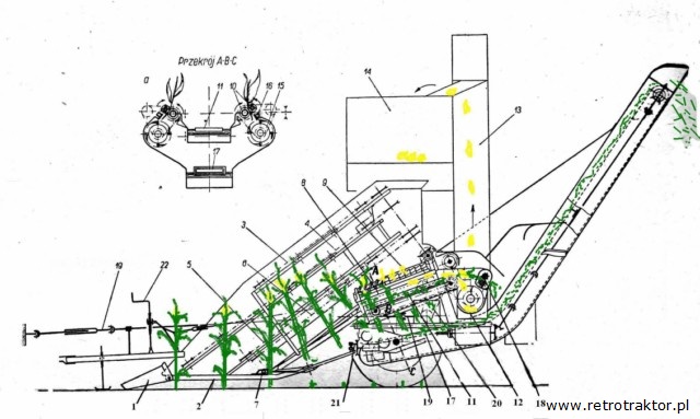 8- przednia część wałków łuskającego, uzwojona śrubowo do transportu łodyg; 9- górna część wałków, służąca do odrywania kolb, 10- wałki łuskające; 11-przenośnik taśmowy; 12-ślimak transportujący; 13-przenośnik pionowy; 14-zbiornik kolb; 18- wałki odrywające kolby z tej części łodyg, które nie zostały przeciągnięte.