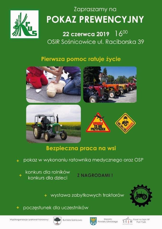 22 czerwca br. Kasa Rolniczego Ubezpieczenia Społecznego zaprasza na pokaz prewencyjny Pierwsza pomoc ratuje życie – Bezpieczna praca na wsi. Weźmie w nim udział ratownik medyczny oraz strażacy z Ochotniczej Straży Pożarnej. W programie przewidziany jest również konkurs dla rolników oraz dzieci. Wydarzenie uświetni wystawa zabytkowych traktorów, współorganizowana przez Klub Miłośników Starej Techniki RetroTRAKTOR. Dla uczestników przewidziany został również poczęstunek.